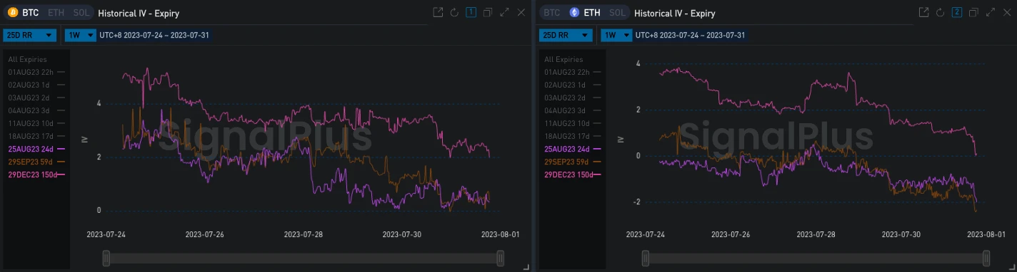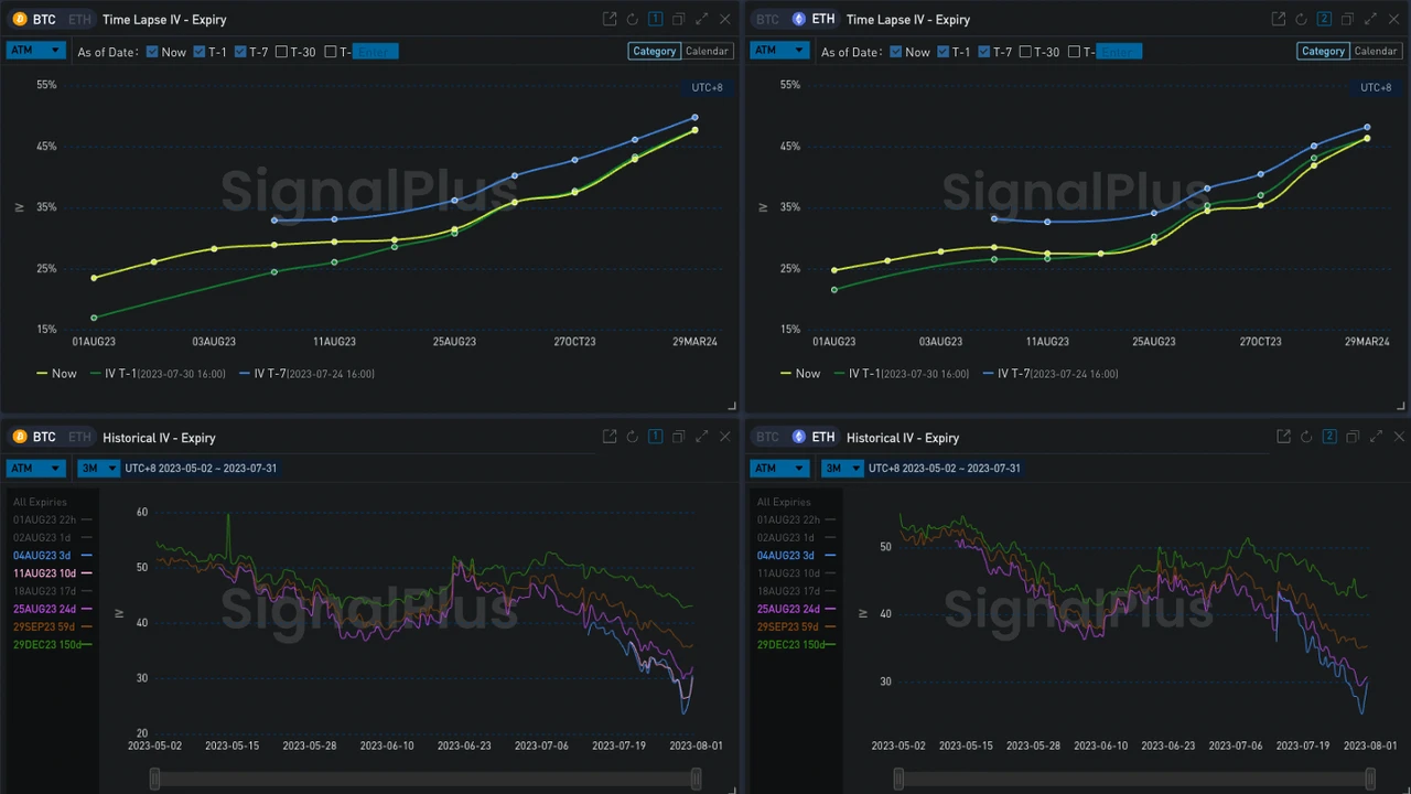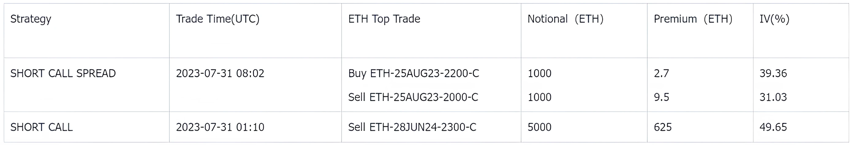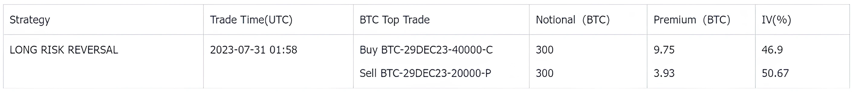 与之相反的在 BTC 方面,获利于近期的 IV 低迷,RR 下跌,又见到交易员对年底 Risky 的买入(300 BTC 29 DEC 23 20000/40000 RR)。十月 38000 累计 575 BTC 大宗买入,是昨日最大的 OI 变化点位。九月则有累计 500 BTC 的 Long Call Spread,将 40000-C 的看涨仓位,置换到更接近的 33000-C。