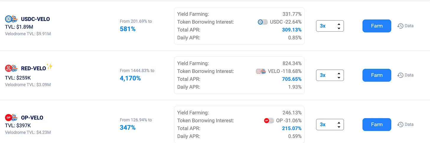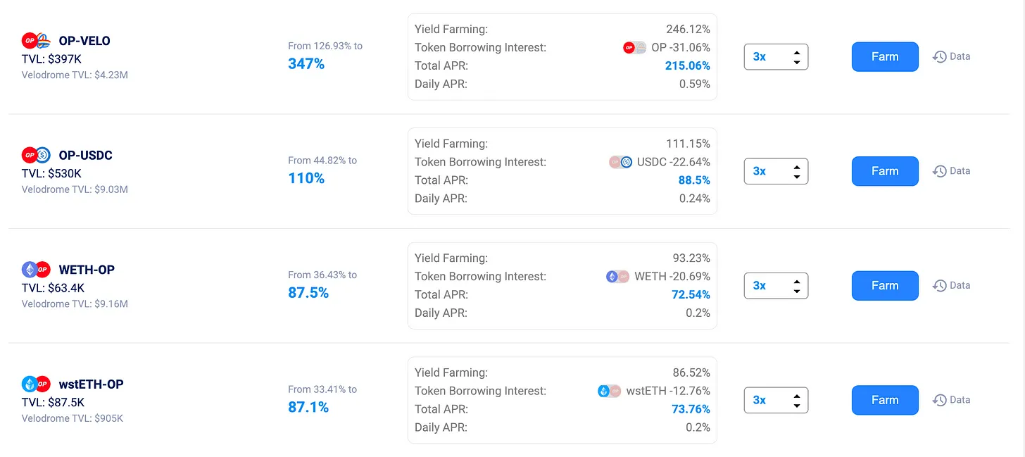 Extra 本身是一个借贷协议,但协议自带 UI/UX 支持用户通过协议加杠杆参与 Velo DEX 的流动性挖矿,到现在为止协议依然在提供着较高的流动性收益。高额的 LP 收益减缓了用户持有 $VELO 时所面临的 Token 排放(另一种方式是锁定 VE 吃贿赂收益)。目前其 TVL 是 19 M,是 OP 最近增长最快的协议。