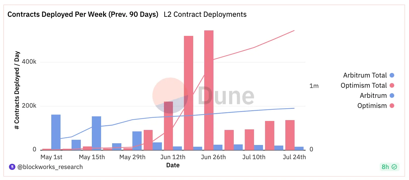 另外一个 OP 生态正在迅速增长的佐证是:最近 90 天内 OP 的合约部署量变化。所以在最近的半年,OP 生态应该会跑出来一些表现不错的协议。