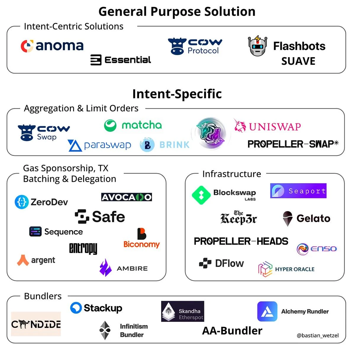 下面的插图提供了一份非详尽的意图实验项目概述。然而,需要承认的是,不同类别之间可能存在一些重迭,并且这个展示是简化的。目前引起重大关注的意图特定应用的典型例子是 1inch Fusion 或 UniswapX。由于这个领域还很年轻且快速发展,这个插图可能在短短几个月内发生很大变化。