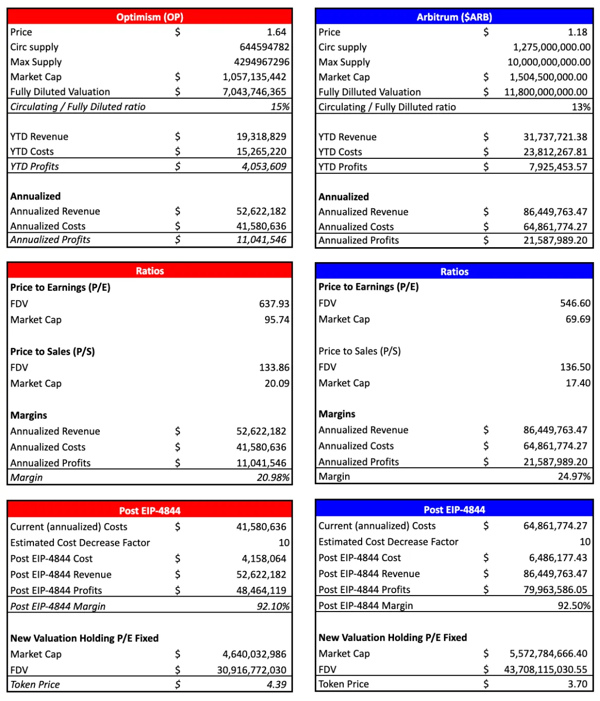 考虑到上面部分中 Arbitrum 财务状况的现状,我们探讨了在某些假设下 Arbitrum 估值的可能变化。由于预计 EIP-4844 后成本将显著降低,人们预期在收入保持不变的情况下,利润和利润率将增加。