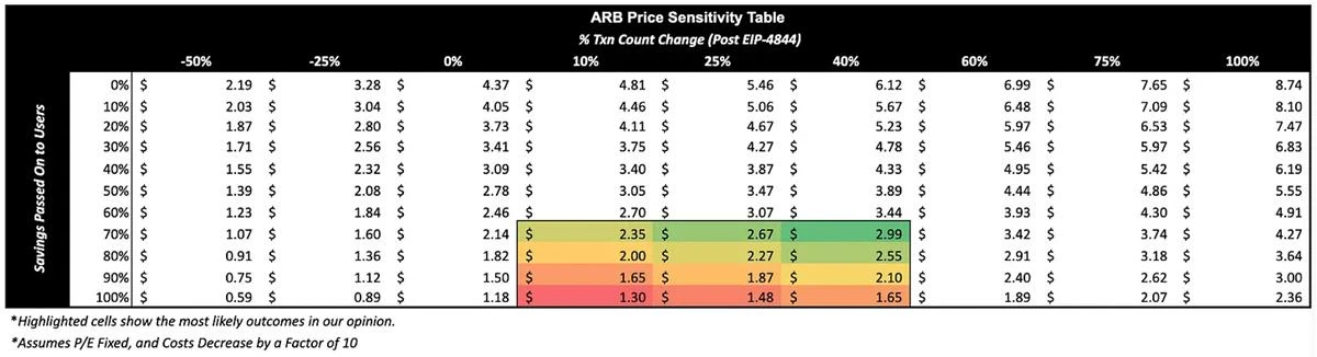 我们可以计算出这些变化对 ARB 和 OP 价格的影响。例如,如果 Tx 量增长了 40% ,并且只有 90% 的费用节省传递给用户,那么 ARB 的价格将为 2.10 美元。