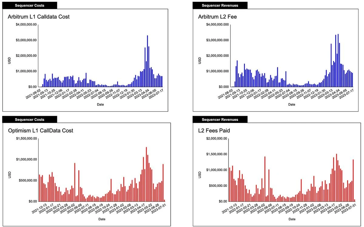 在深入讨论我们预计在 Arbitrum 和 Optimism 中看到的变化之前,重要的是我们考虑到 Arbitrum 和 Optimism 在 L1 计算定价方面的差异(如前面的 L2 费用定价部分所解释的)。鉴于 Arbitrum 的 L1 定价预言机,我们现在知道它很可能将 100% 的费用传递给用户(除非我们看到治理投票)。对于 Optimism 来说情况并非如此,因为他们仍然控制着动态开销变量。