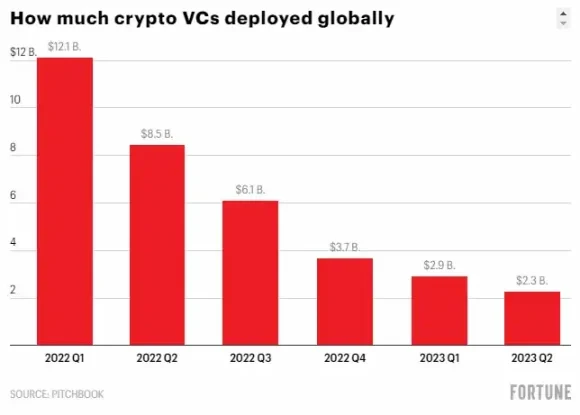 2023 年第二季度,加密项目的风险投资资金降至 23 亿美元,比 2022 年同期下降了 70% 以上,因为许多投资者转而将目光投向了更热门的人工智能领域。加密货币风险投资的剧本正在被重写。