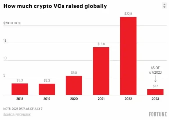 尽管如此,一些加密货币 VC 仍在消耗他们的备用资金。例如, Polychain Capital 已经投入了其第三只基金的大部分资金,该基金是在 2022 年和 2023 年筹集的。尽管它已经成功为第四只基金筹集了 2 亿美元,但其他的加密货币 VC 并没有那么幸运。到 2023 年为止,加密货币 VC 筹集的资金只有大约 20 亿美元,而在 2022 年全年,这个数字超过了 220 亿美元。