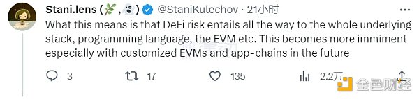 事后,Aave 及 Lens 的创始人 Stani(@StaniKulechov)也在社交媒体发布了长文表达自己的感想:这次 Curve 被攻击事件意味着,DeFi 风险一直涉及整个底层堆栈、编程语言、EVM 等。这警示了我们应更加谨慎和敏感,尤其是将来使用定制的 EVM 和应用程序链时。