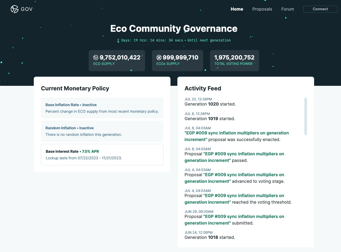 Eco 的特色之一就在于灵活的货币政策,可通过治理调整 ECO 的货币供应。ECO 和 ECOx 都可参与 Eco 的治理,其中 ECO 的投票权为 1 ,ECOx 的投票权为 10 。