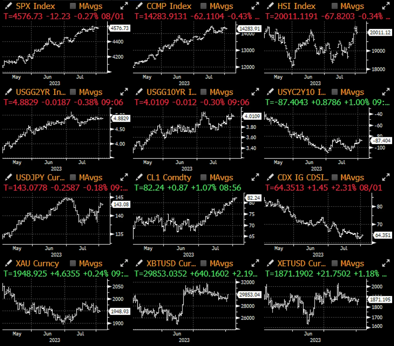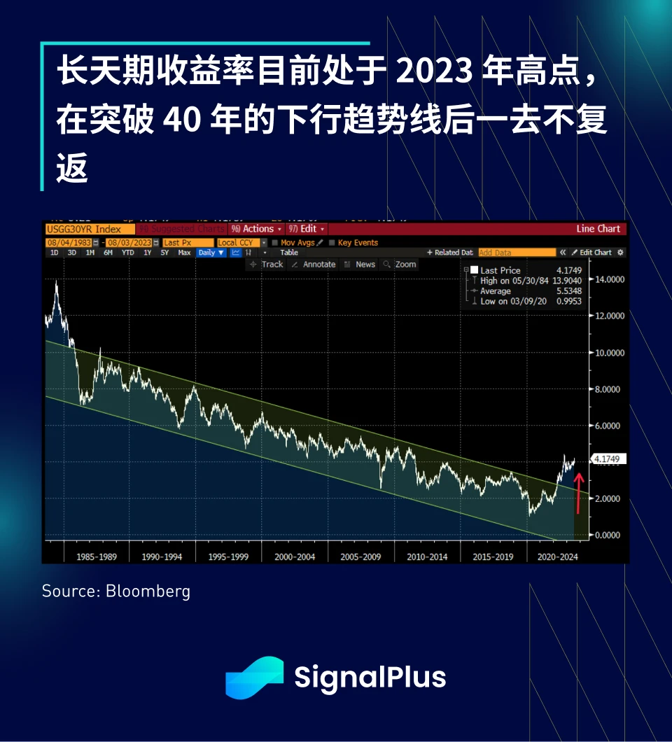 昨天市场突然顿悟, 财政部借贷预估金额的急遽增长意味著会有大量 (真的很多) 待售债券 , 30 年期债券收益率昨天上涨了 9 个基点,无论怎么看,整体美债收益率目前都处于 2023 年的高点;或许会有人将债市的大幅下跌归咎于 Fitch 不合时宜的评级下调,或是 ADP 就业数据过于出色(7 月就业人数 + 32.4 万人,高于预期的 19 万;继上个月强劲新增 45.5 万后,服务业也再次 + 30.3 万),但 我们更加担心,在预期供应量会大增的情况下,这可能是长天期实际收益率重新定价走高的开端。