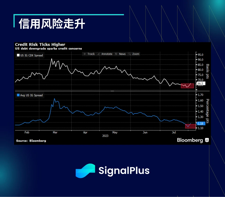 比较值得担忧的是,即使我们假设全额再投资固定收益, 每季度 1 万亿美元的债券融资规模仍是很一大笔钱,特别是考虑到货币紧缩仍在进行中,且在今年剩余时间里可能会加速 ;此外,与其担心美国联邦信用状况,或许更应该担心美国债券市场,投资等级债券平均利差已回落至周期低点,国债供应泛滥和评级下调很难不进一步对利差产生负面影响,特别是考虑到当前利差较为紧缩的情况。