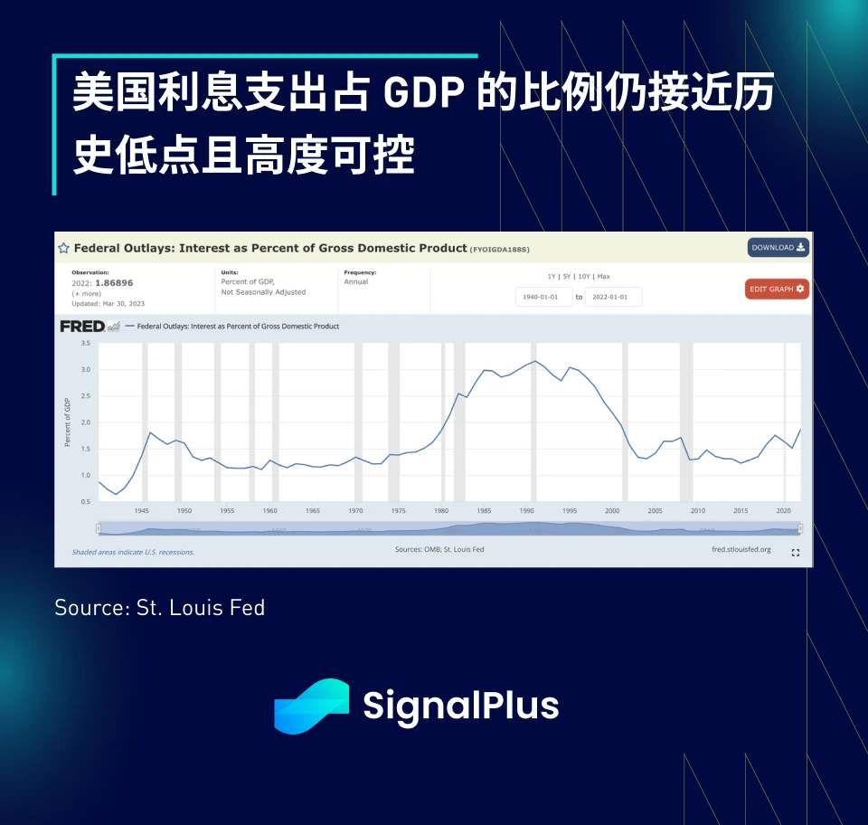 尽管如此,如我们先前多次提及的, 美国市场绝对不存在偿付能力或流动性问题,这只是资产重新配置的考虑而已,客观来看,即使调整到当前较高的利率水平,美国政府利息支出占 GDP 的比例也仅是 2% ,且接近 1940 年以来的历史低点 ,即使利率从当前水平进一步翻倍,这个比例仍将低于 5% ,从偿付能力的角度来看,几乎没什么值得担心的。