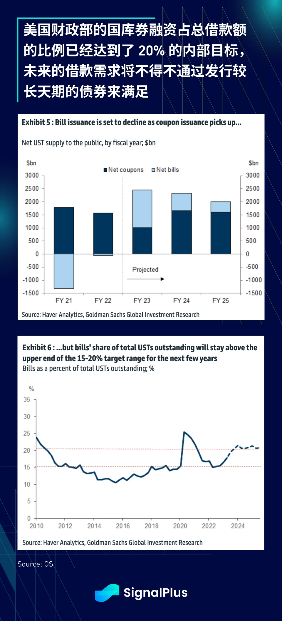 此外,由于财政部在最近的债务上限激战期间经历了现金流紧张的情况,他们也宣布接下来要保持更高比例的现金部位以更好地管理流动性,并将继续最大限度地通过更灵活的短天期国库券来满足其借款需求,然而, 相比于较长天期的债券,财政部对于国库券融资目前还维持著 20% 的内部限制,且该上限已经达到,因此额外的资金需求将不得不通过较长天期的债券发行来满足。