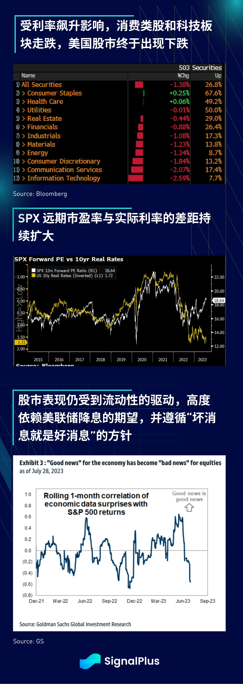 当前美国实际利率的扩大,已经加剧了不同资产与股票间的差异,这 体现在 SPX 远期市盈率与实际利率间的差距不断扩大 ,不过美国股市也终于迎来了下跌,SPX 指数昨天收盘下跌 1.4% ,主要是因为债券收益率大幅上涨导致科技股和消费股走软,不过接下来较大的价格走势可能要取决于周五非农就业数据的表现,以及巨头 Apple 即将于今天收盘后公布的财报结果。