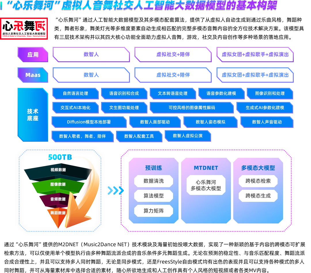 2023 年 8 月 5 日,Web 3.0 沉浸式互动社交元宇宙——美踏元宇宙的研发及运营公司美踏控股集团(www.meta 48.com)及上海丝芭文化传媒集团有限公司(www.snh 48.com)于上海正式发布了国内首个全面聚焦于虚拟数字人音乐舞蹈及虚拟社交的垂直领域多模态人工智能大数据模型“心乐舞河”。