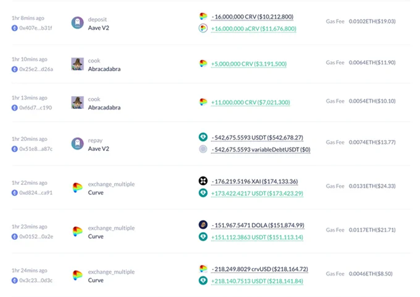 链上数据显示,Curve 创始人 Michael Egorov曾从 Fraxlend 借入约 376 万枚 FRAX,并用于偿还 Aave V2 贷款,后又相继偿还 100 多美元贷款。随后他向 Aave V2 与 Abracadabra 均存入 1600 万枚 CRV。