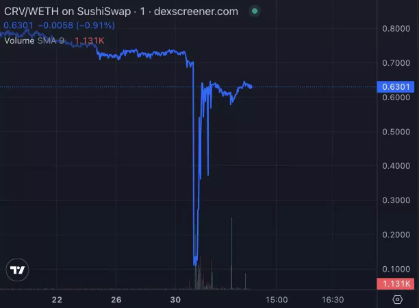 中心化交易所显示 CRV 价格触底至 0.583 美元,但这个代币在链上却触及 0.109 美元的低点。CRV/ETH 池被黑客攻击后,链上 CRV 流动性变得极差,导致链上价格波动剧烈。