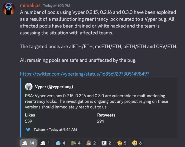 Curve官方回应表示:因为Vyper 0.2.15存在漏洞,部分稳定币池(alETH/msETH/pETH)已被攻击。我们正在评估情况,并会随着事态发展向社区发布更新,其它池子是安全的。