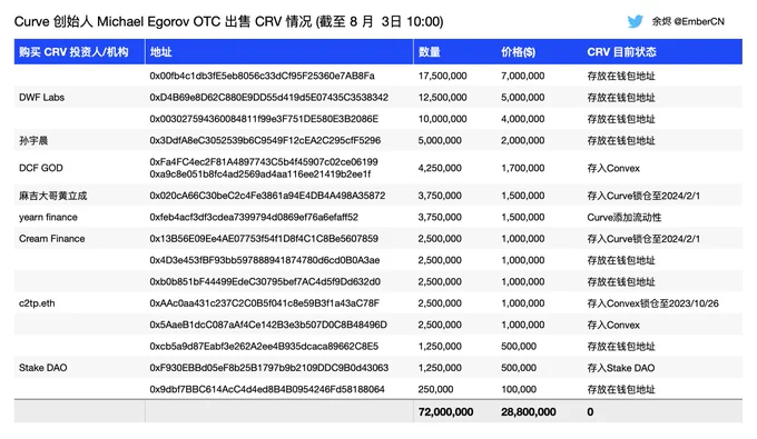 据链上分析师余烬监测,截至 8 月 3 日上午 10:00,Curve 创始人以0.4美元的价格通过 OTC累计向 15 个投资者/机构出售了 7200 万枚 CRV,共获得资金 2880 万美元。