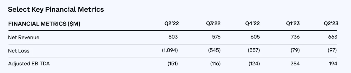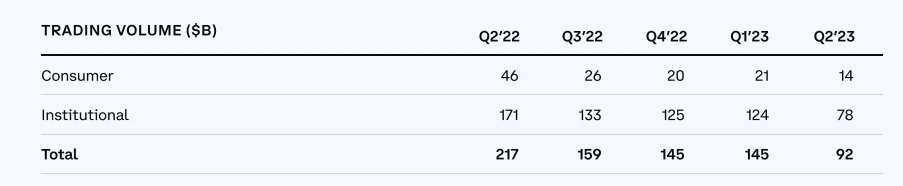其中,第二季度用户交易收入为 3.1 亿美元,环比下降 12% ;交易量为 140 亿美元,环比下降 33% 。第二季度机构交易收入为 1700 万美元,环比下降 24% ;交易量为 780 亿美元,环比下降 37% 。