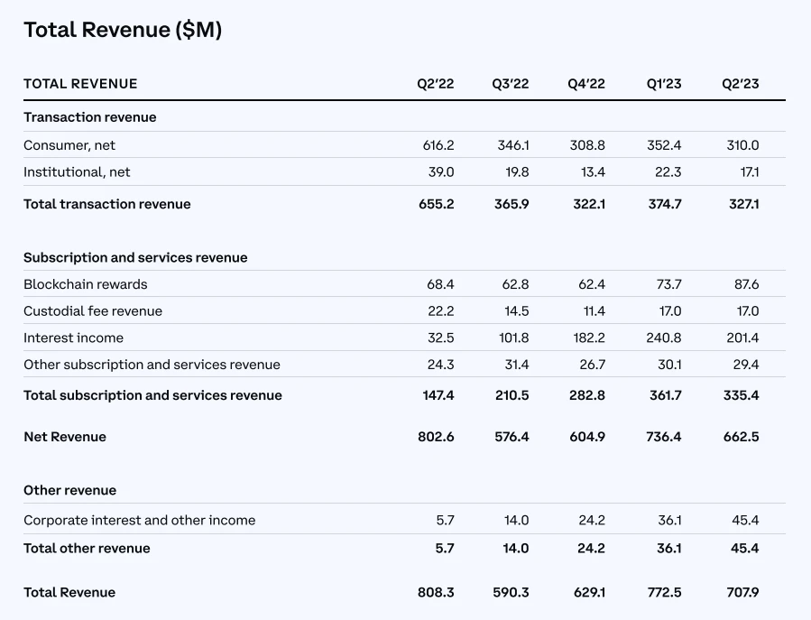 Coinbase 披露,第二季度总交易量环比大幅下降至 920 亿美元,第一季度为 1, 450 亿美元;总交易量与去年第二季度 2170 亿美元相比下降了 57% 。第二季度交易收入为 3.27 亿美元,环比下降 13% ,在交易量低迷的情况下,这一数字表现平平,第一季度为 3.75 亿美元;去年第二季度的交易收入为 6.55 亿美元。