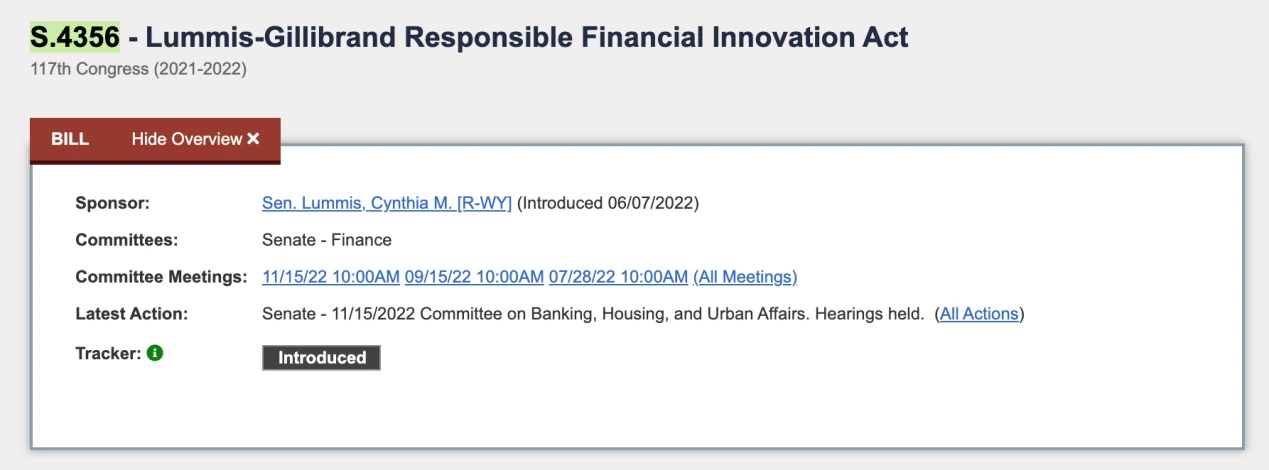 关于上文中提到的《鲁米斯-吉利布兰德责任金融创新法案》(S.4356 — Lummis-Gillibrand Responsible Financial Innovation Act)是由参议员 Cynthia Lummis(怀俄明州共和党)和 Kirsten Gillibrand(纽约州民主党)重新提出,Cynthia Lummis 是一位加密支持者,被称为参议院的“加密货币女王”,该法案曾被认为是参议院有史以来最全面、两党支持最深厚的加密货币法案。 FTX 的崩溃使该提案被搁置,在 2022 年 11 月份之后未有新的动作。