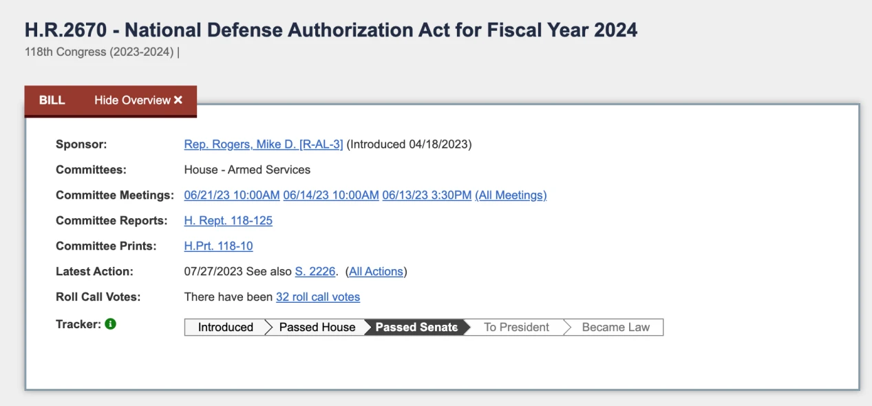 《国防授权法案》是美国国会提出的年度法案,重新定义美国次年的军事预算。众议院和参议院分别提出了《 2024 财年国防授权法案》H.R. 2670 和 S. 2226 。
