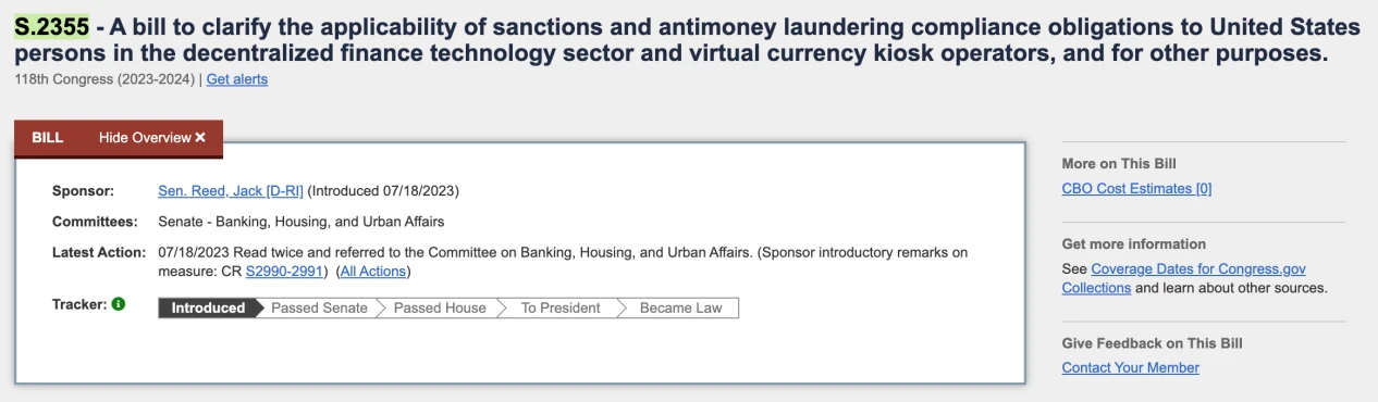 7 月 18 日由参议员 Jack Reed 提出,并由参议员 Mark Warner(弗吉尼亚州民主党人)、Mike Rounds 和 Mitt Romney(犹他州共和党人)共同发起,是一项专注于洗钱和制裁合规的两党法案。Jack Reed 在其个人网站上将该法案命名为“THE CRYPTO-ASSET NATIONAL SECURITY ENHANCEMENT AND ENFORCEMENT (CANSEE) ACT”。