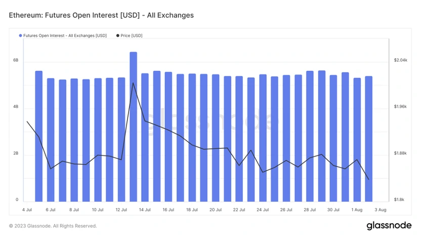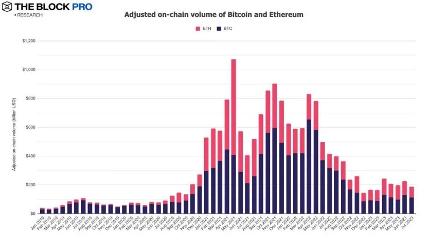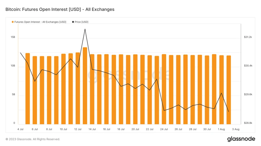 市场交易进入冰点。7 月链上总交易量下降 17% ,合规交易所现货交易量也下降 17% ,为 2020 年 10 月以来的最低交易量。7 月 BTC 期货持仓量下降 8% ,期货成交量下降 27% 。