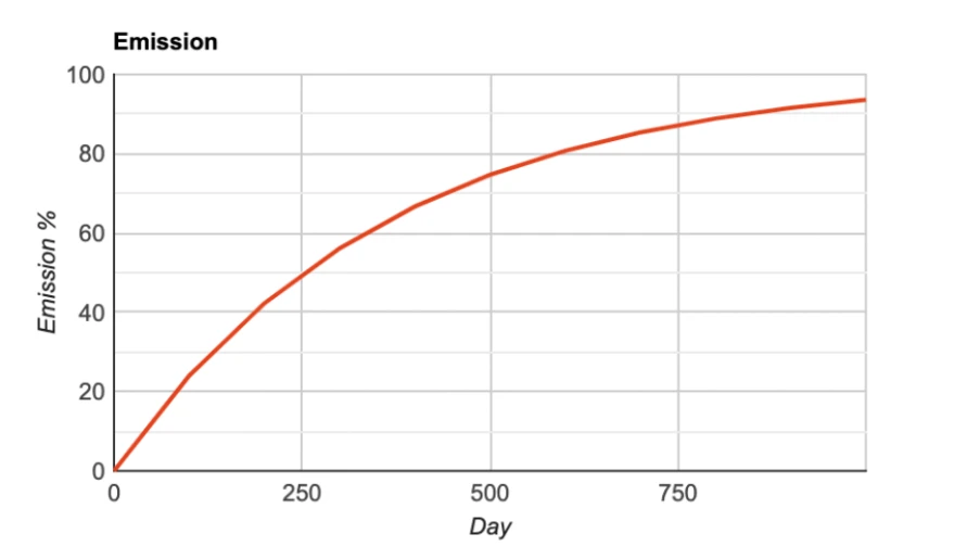无 ICO,无预挖,无团队预留。总量 1 亿枚,现已经释放 6461 万枚,流通量占比 64% ;释放速度较快,两年后流通量占比约 80% 。下图显示了代币释放时间表和每个区块链奖励代币数量时间表。每区块代币奖励根据特定公式持续降低,形成平滑曲线。
