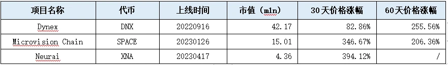 从上表可以看到,这几个项目上线的时间尚不足一年,市值在 5000 万美元以下,近两个月价格获得不错的涨幅。