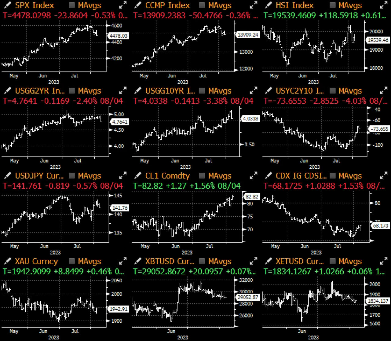 在股市方面,由于就业数据不冷不热,市场认为足以阻止美联储进一步加息, 股市试图在此叙事上展开又一次的反弹 ,然而, 在纽约时间刚过下午 1 点后,市场突然出现抛售,SPX 指数在没有消息的情况下迅速下跌 1.5% ,这是自 3 月份反弹开始以来我们没有真正看到过的技术面看跌走势 ;此外,在发布第二季度财报后, Apple 已完全打破今年以来的上行趋势线 ,反转向下,而股市 VIX 也终于从 4 个月的沉睡中苏醒。在大多数市场参与者看多,且多头敞口回到历史高点的此刻,我们是否终于看到股市出现暂时性的顶部、正好赶上以季节性来说较具挑战的秋季?唯有时间能告诉我们答案了,不过周三的 CPI 数据或许可以提供另一个关键线索。