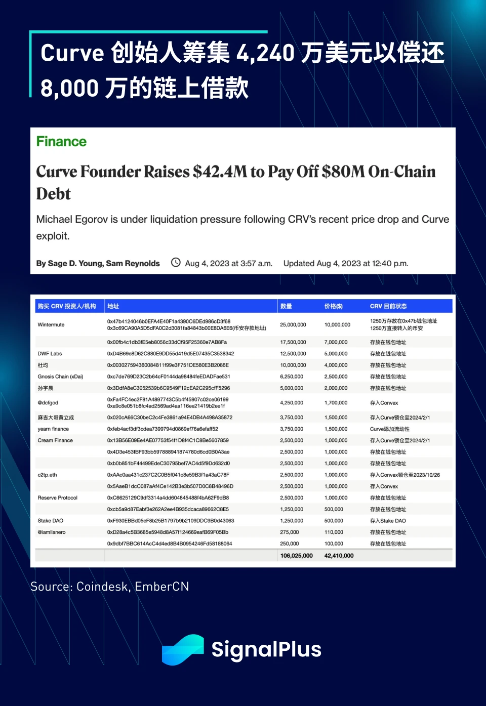 在 DeFi 方面, Curve 事件仍未落幕,不过最坏的情况似乎已经过去了 ,黑客已经开始退还部分窃取的资金( Alchemix 追回了 1, 200 万 的 ETH,JPEG 追回了 1, 000 万),而 Curve 创始人 Michael Egorov 似乎通过向 OTC 买家出售 CRV 代币偿还了约 5, 000 万的 DeFi 借款(价格约为 0.40 美元 vs 现货价格 0.62 美元),希望这已经是这波 FUD 的尾声,虽然这个事件对流动性的负面影响可能还会持续一段时间。