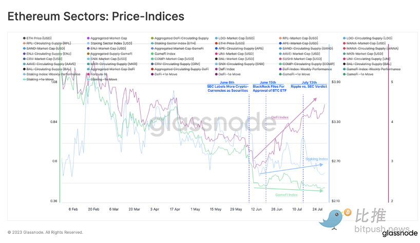 特别是与 DeFi 领域相关的代币表现最为强劲,我们的 DeFi 指数价格自 6 月 11 日低点以来上涨了 56% 。与之相比,其他关键市场领域,如 GameFi 和 Staking,表现不佳。