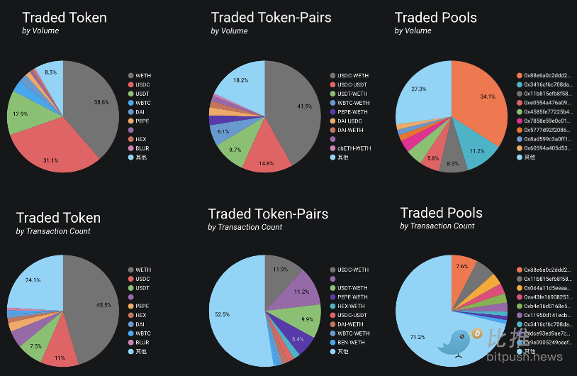 下面的交互式图表显示了每种类型交易者偏爱的代币和交易池,所有三种交易者类型都明显偏爱最大和最流动的交易对 ETH-USDC 和 ETH-USDT。