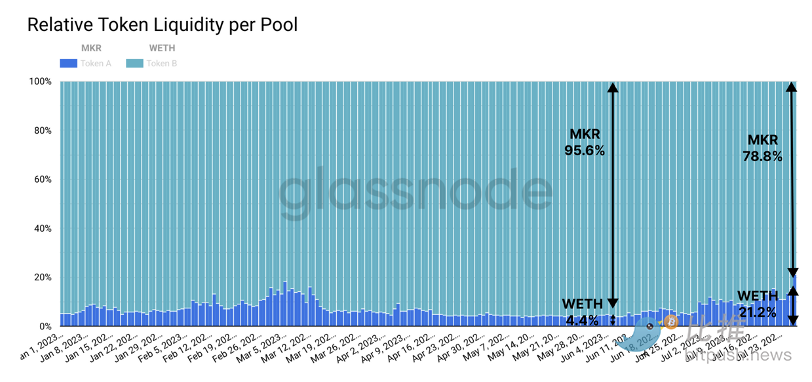 在审查该池的组成时,我们可以清楚地看到 WETH 的份额增加,现在占总量的 21.2% 。这是交易者越来越多地用 WETH 购买 MKR 的结果,表明自 6 月初以来对 MKR 的需求明显增加。