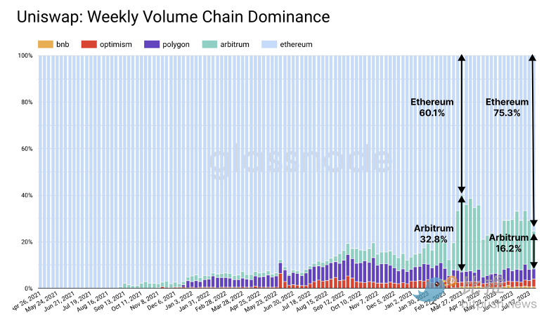 通过研究 Uniswap 交易量在不同 Layer 2 网络上的分布,我们可以得到更清晰的图片。很明显,相当一部分的交易已经从以太坊主网转移到了 Arbitrum ,吸引了多达 32% 的交易量在 3 月份。这一趋势在 6 月和 7 月仍然持续,这在一定程度上解释了我们上面观察到的以太坊上交易量较低的情况。