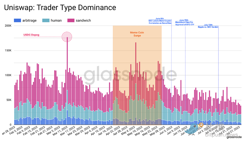 我们可以看到,人类交易者在 USDC 解锁或迷因代币狂热等重大事件期间非常活跃。随着价格波动加剧和“目标交易者”的涌入,套利机器人和夹子机器人也紧随其后,在人类交易活动增加的高峰期间,它们的活动量增加了两到三倍。