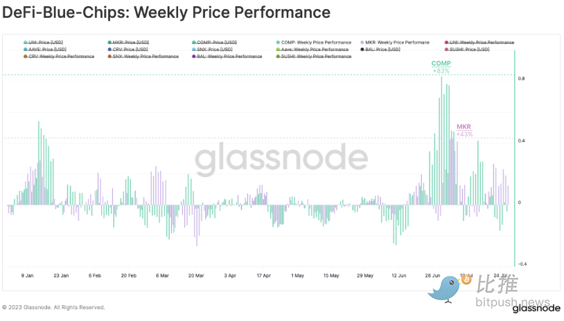 2023 年,数字资产的监管环境一直在反复变化,正面和负面消息交织。近几周,特别是 DeFi 代币经历了超常表现,其中 MKR 和 COMP 领跑。然而,通过审查 Uniswap 上的交易活动,我们发现这些价格上涨并没有在去中心化交易所的交易活动中得到体现。
