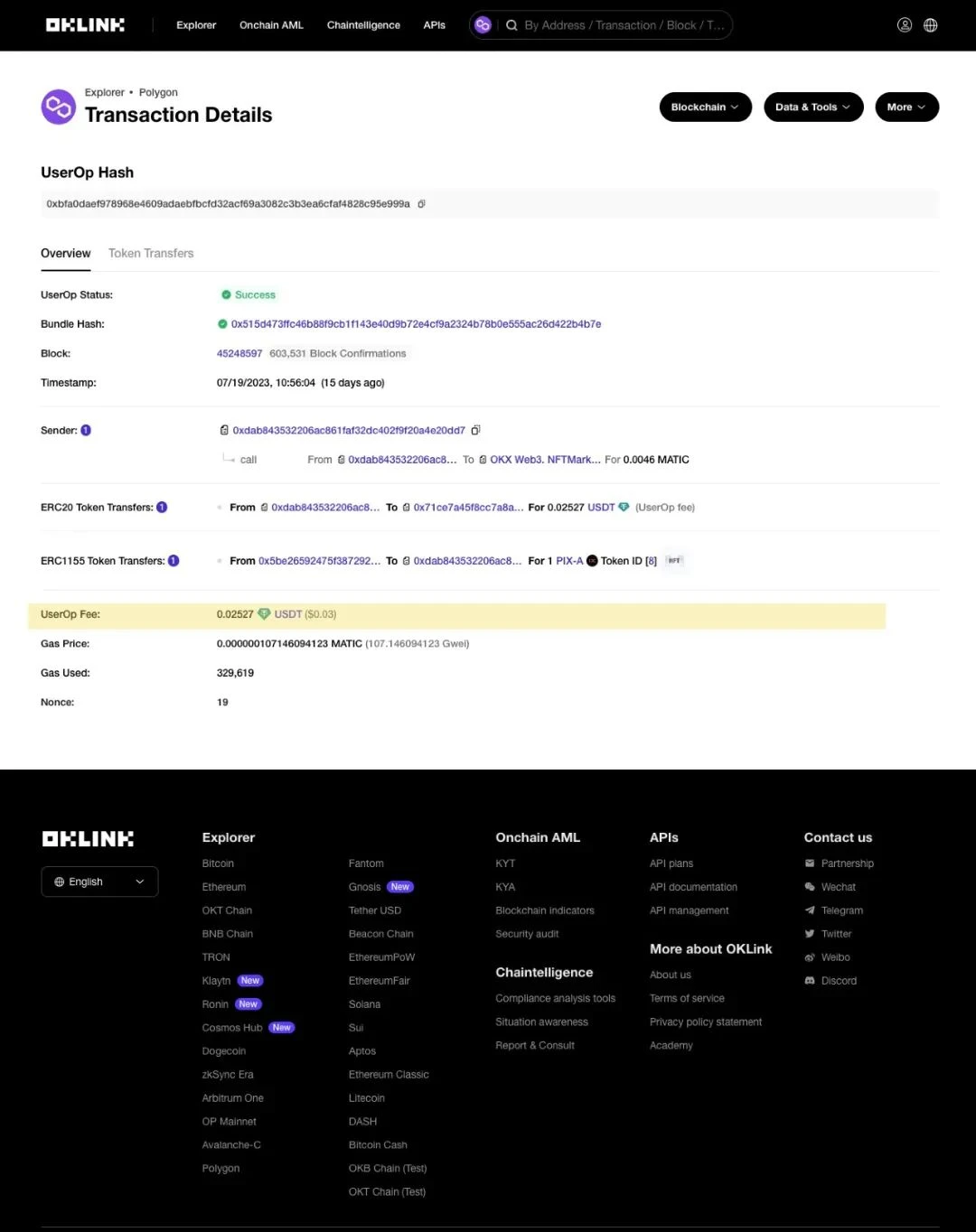 如果想要找到打好包的那一抹绿色,账户抽象的解析就是关键。通过欧科云链 OKLink 多链浏览器,就可以像使用谷歌一样来查询账户抽象的具体有效信息即特定的用户操作(User Operation)。这样,我们既可以通过账户抽象智能合约发起交易,还能知道该操作具体的过程、路径、成本和执行效果。账户抽象的解析(Account Abstraction Analysis) 作用就是帮助用户了解区块链上交易和合约执行的相关信息,包括交易费用、合约执行的相关信息和日志,从而更好地了解智能合约的执行情况等等。