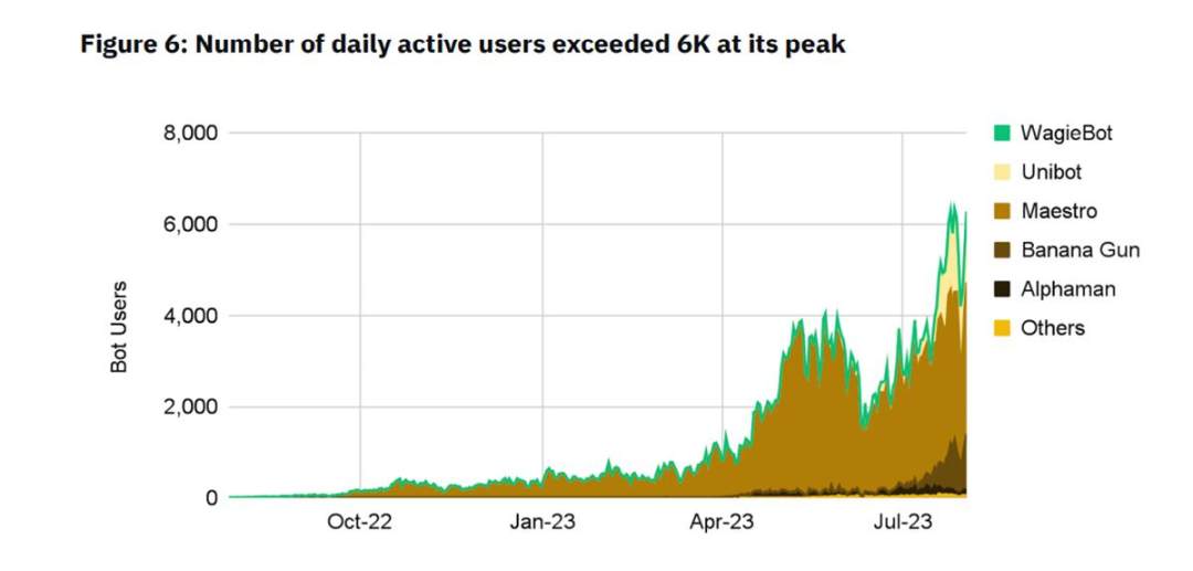 Maestro 保持领先,每日活跃用户约为 2000-3000 人。Unibot 正在赶上,近几周该差距显著缩小;每日活跃用户在 7 月的两周内从约 400 激增至峰值时的 1700 人。