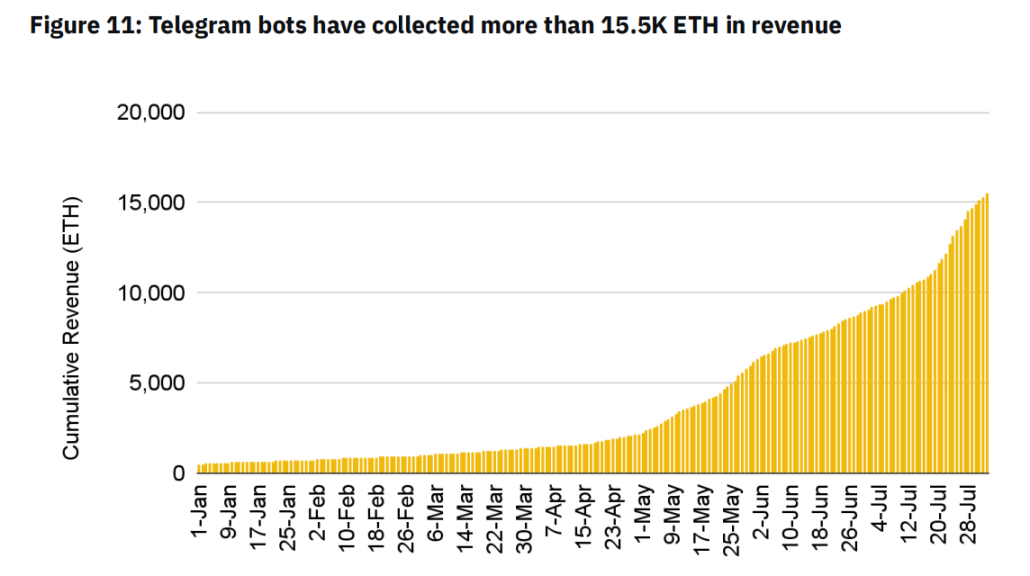 Telegram 机器人从今年至 7 月,已经收集了超过 1 万 5 千个 ETH( 约合 2870 万美元 ) 的收入