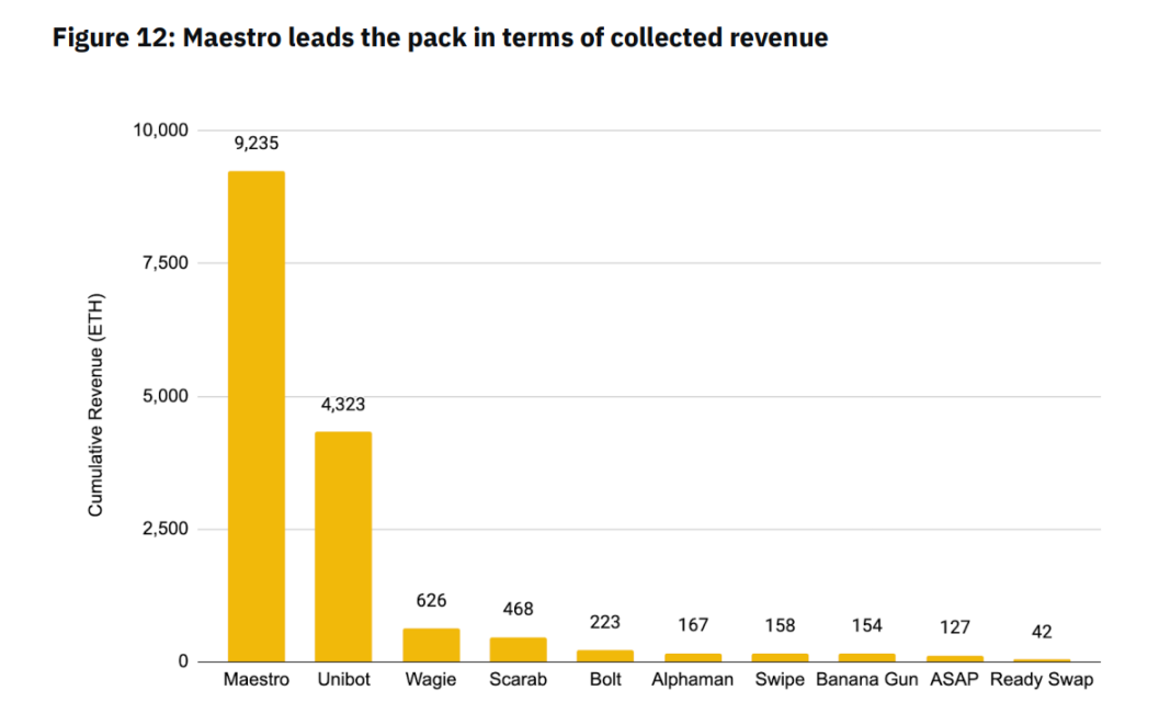 Maestro 目前在累计收入方面领先, Unibot 位列第二,但二者收入额差距 1 倍以上