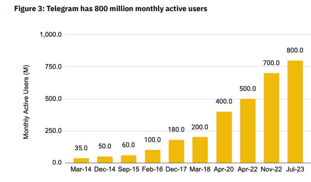 Telegram 拥有 8 亿月活跃用户, 切那部分在电报上「耳濡目染」但没有进圈的用户其实是个好选择。
