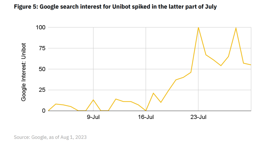 关键贡献者是 UNIBOT 代币,它占据了 77% 以上的市场份额。以 Unibot 为代理,谷歌搜索上的兴趣也持续增加。
