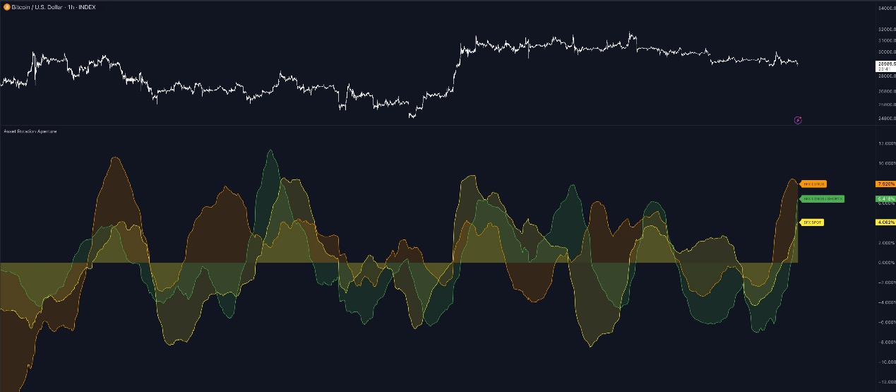 Bitfinex 的 Asset Rotation Aperture 指标可并排跟踪多个资产的累积交易量的 delta 和未平仓合约 delta。目前有三项都在看涨。