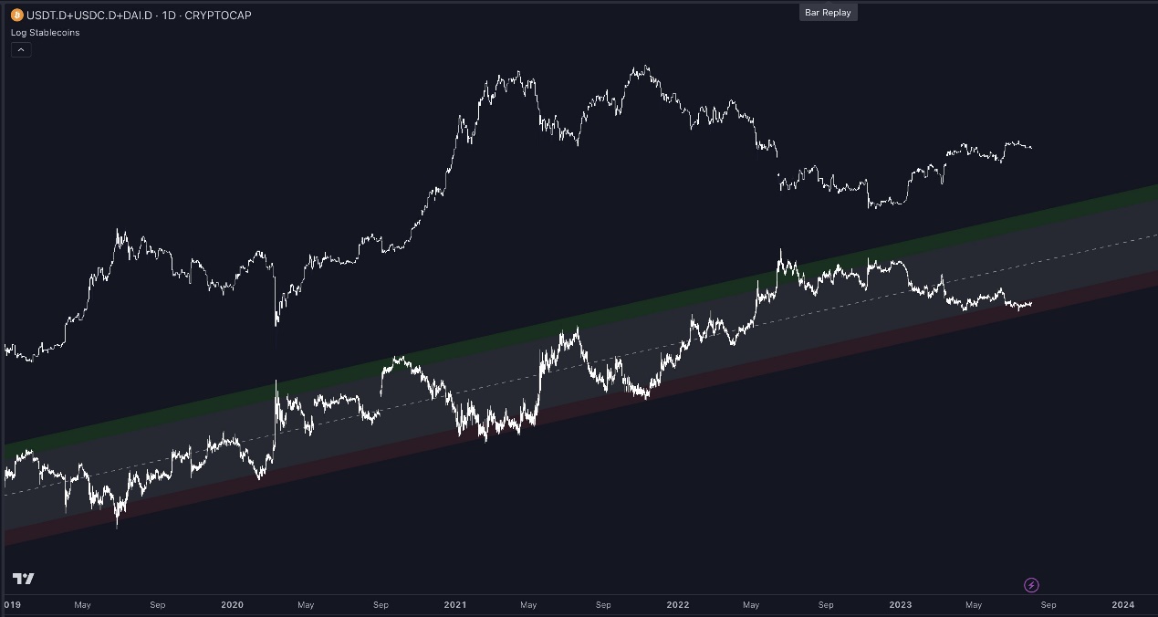 但是稳定币市值比率相对于其对数趋势线被压垮,该趋势线是加密市场最重要的阻力位之一(倒过来看,阻力位像支撑位)。要进入全面牛市,对数趋势线可能必须被突破。(完全有可能发生)。