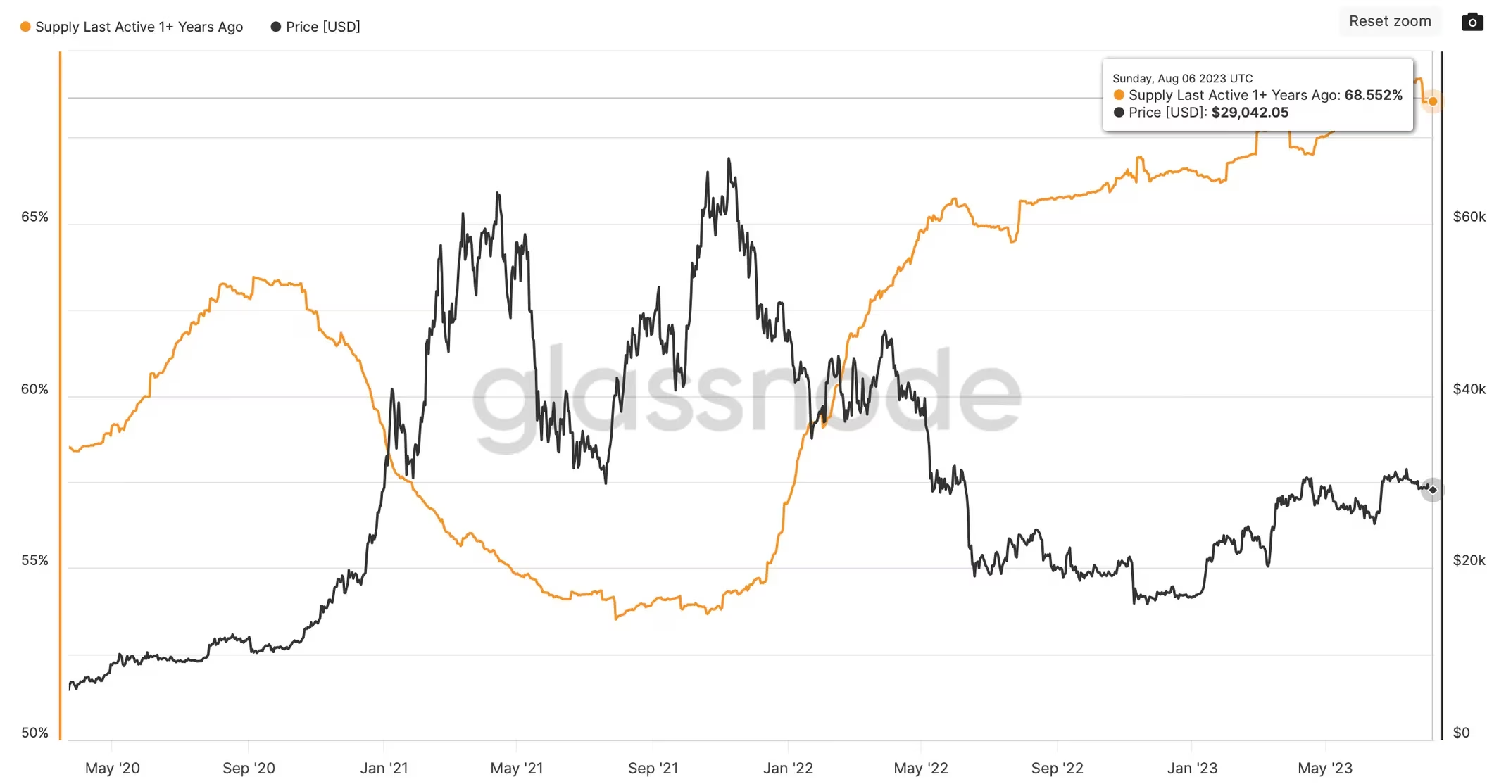 逾1330万枚比特币在链上休眠至少一年,占流通供应量68.54%