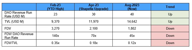 在短期内,市场似乎已经从最初围绕上海/Capella 的炒作中转移。这从 Lido 的总锁定价值(TVL)和收入增长率上升,而估值倍数压缩的情况可以看出。我们相信,这种估值和基本面的偏离不会永远持续,而 LDO 现在提供了一些最佳的风险调整回报。