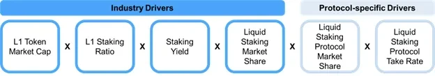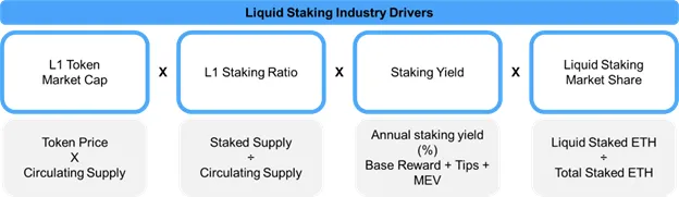 从宏观角度来看,流动性质押收入的潜在规模由以下四个增长驱动因素决定:L1代币的市值、L1的质押比率、质押收益率以及质押服务商的市场份额。