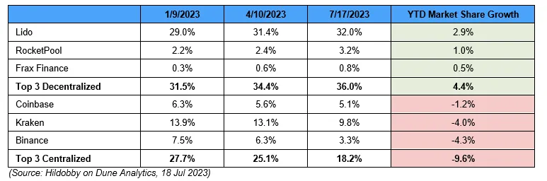 我们预计,在中心化参与者提供的质押服务受到增加的监管审查的背景下,流动质押领域将受益。截至目前,排名前三的中心化质押服务提供商已经放弃了 9.6% 的市场份额,这部分份额已经被其去中心化对手部分吸收。值得注意的是,Lido 一直是这一趋势的最大受益者,市场份额增长了 2.9% 。我们相信,这表明由于 stETH 在 DeFi 中的流动性和可组合性,它仍然是大多数质押者的首选之一。