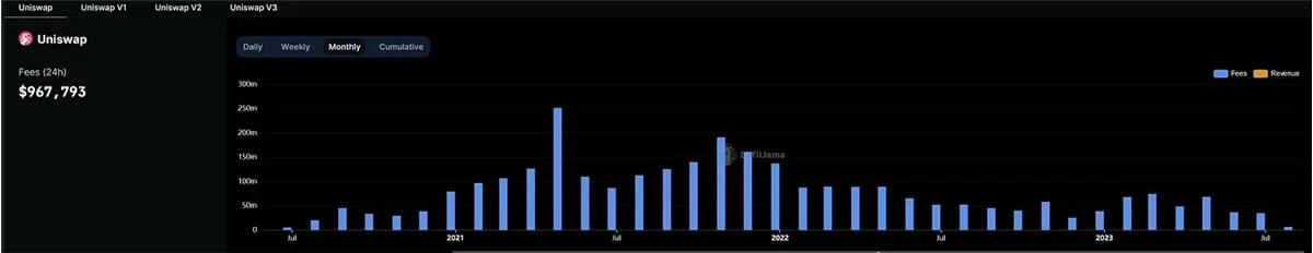 通过对比 Uniswap 和流动性质押赛道龙头 Lido 的月收入,可以很容易地说明该赛道收入的质量。Uniswap 的月度收入在 2021 年 5 月和 11 月分别出现了两个局部高峰,与这两个月的市场顶部相吻合。随后,在随后的熊市中,随着交易量和流动性的减少,月度收入逐渐下降。